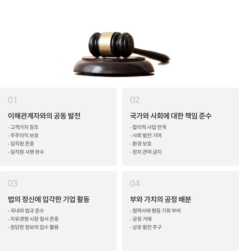 동화일렉트로라이트는 임직원의 올바른 경영 활동을 위한 윤리규범을 제정, 실천함으로써 공정하고투명한 경영을 달성하고 있습니다.